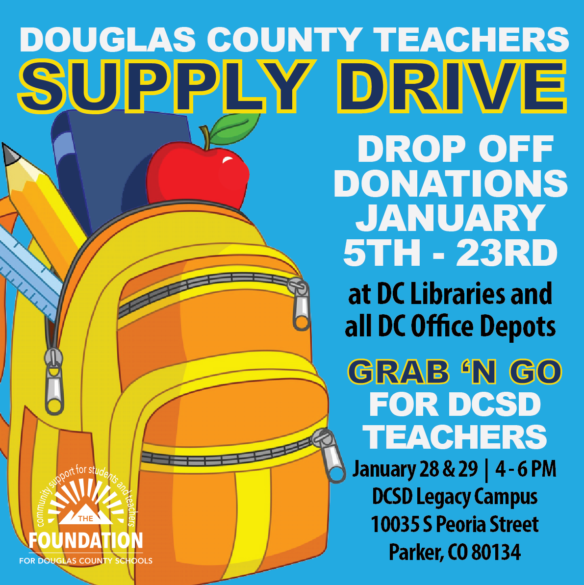 The Foundation for Douglas County Schools coordinates the Lend A Hand School Supply Drive every summer, with the goal of collecting, purchasing, assembling and distributing backpacks and school supplies to students in need.